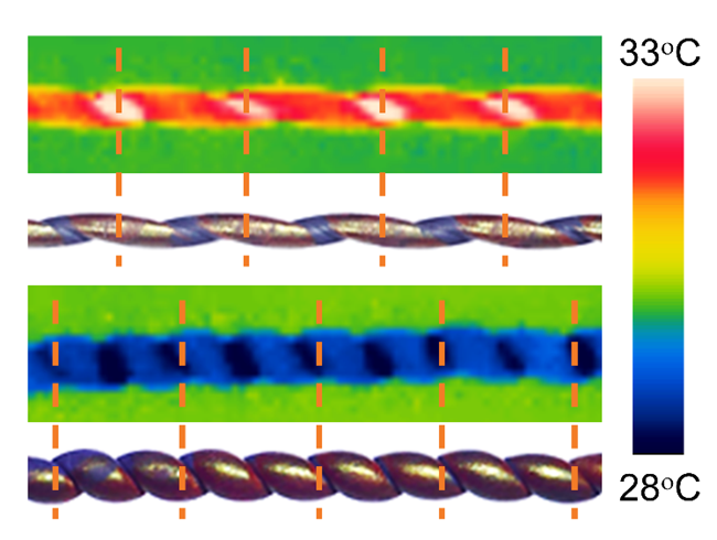 “扭热制冷”中的另外一个特殊现象是纤维不同部位呈现不同的温度(在红外成像仪中,会发现升温会显示为红色,降温显示为蓝色)。这是由于纤维加捻产生的螺旋沿纤维长度方向的周期性分布所致。