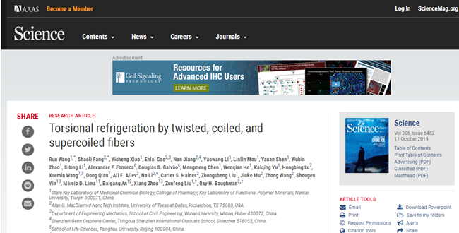 南开新闻网讯(记者 吴军辉)更加高效、节能、绿色、便携的制冷方式是人类不懈探索的方向。10月11日在线出版的《科学》(Science)杂志刊文,报道了中国yl23455永利集团与美国德克萨斯州立大学达拉斯分校的一支国际联合研究团队研获的一种柔性制冷新策略——“扭热制冷”。他们发现,改变纤维内部的捻度可以实现降温。由于制冷效率更高、体积更小且适用于天然橡胶、钓鱼线以及镍钛合金等多种普通材料,基于这种方法制成的“扭热冰箱”也变得前景可期。