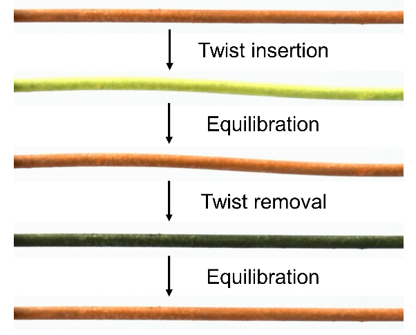 利用“扭热制冷”实现颜色变化的纤维。表面涂覆有热致变色涂料的镍钛合金丝加捻和解捻后的颜色变化图像。
