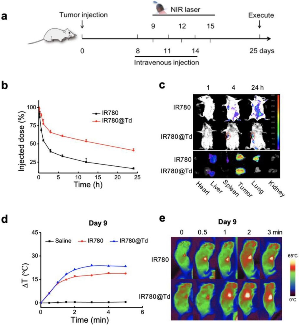 图4. IR780@Td体内药代动力学、生物分布及PTT效率