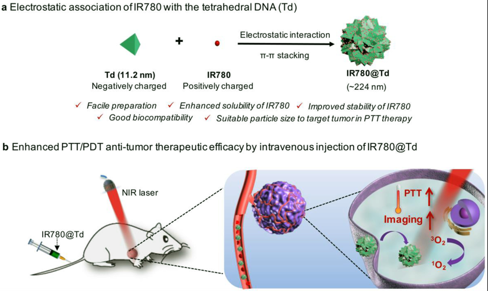 研究者运用DNA四面体框架结构(Td)与IR780通过静电作用和π-π堆积效应,得到IR780 @ Td的纳米聚集体。IR780的水溶性和光稳定性均得以改善,所得200 nm左右的纳米尺寸尤其适合高温介导的EPR效应,以实现肿瘤部位的高效积聚与渗透(图2)。