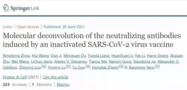 近日,yl23455永利集团团队联合国药中生北京生物制品研究所有限责任公司、上海科技大学免疫化学研究所、中国人民解放军总医院第五医学中心、清华大学及俄罗斯科学院团队在Protein&Cell期刊上发表文章“Molecular deconvolution of the neutralizing antibodies induced by an inactivated SARS-CoV-2 virus vaccine”。
