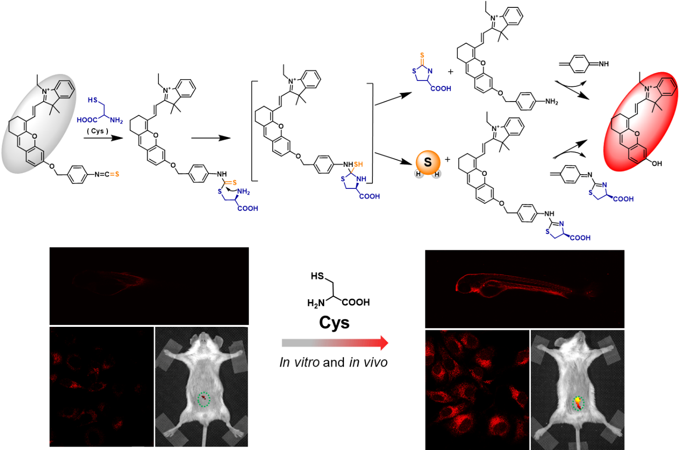 赵炜团队首次设计了一种功能性异硫氰酸苯酯自降解引发剂,将其与经典半花菁染料结合得到一种新型近红外荧光探针CyOH-NCS。由于异硫氰酸苯酯片段对半花菁的羟基保护作用,探针分子处于荧光淬灭状态,在与半胱氨酸发生加成环化消除后,N-二氢噻唑羧酸中间体化合物和伯胺中间体化合物再经历相同的自降解过程,同时释放近红外荧光染料和硫化氢分子。得益于这种高效的自降解策略,CyOH-NCS在体外检测半胱氨酸时表现出了良好的分析性能,并且能够成功地可视化传感活细胞、斑马鱼和小鼠体内的半胱氨酸。此外,硫化氢释放实验还显示CyOH-NCS探针是一种有效的硫化氢供体,表明其作为分子探针和硫化氢供体在病理生理学研究中具有潜在双重应用价值。