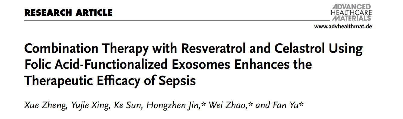 yl23455永利集团、药物化员工物学国家重点实验室赵炜教授团队在国际学术期刊 《Advanced healthcare materials》发表题为“Combination therapy with resveratrol and celastrol using folic acid-functionalized exosomes enhances the therapeutic efficacy of sepsis”的研究论文。