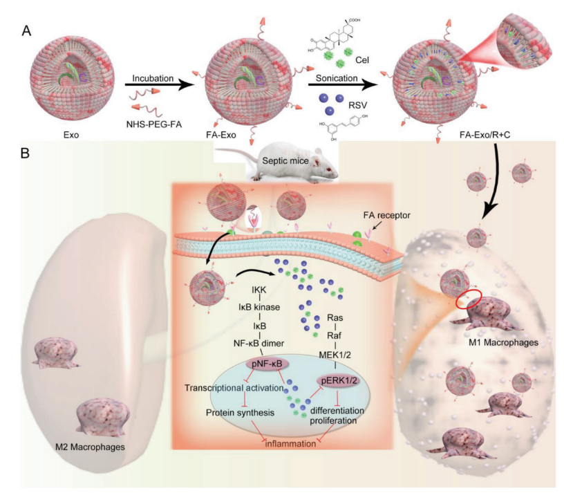 本研究旨在利用叶酸(FA)功能化的的外泌体(Exo)使其具有靶向递送到M1巨噬细胞的优势,增加疾病部位(肺部)的药物积累,同时减少脱靶效应。进一步通过现代药学技术工程化外泌体对白藜芦醇RSV和雷公藤红素Cel(FA-Exo/R+C)的联合递送,实现对脓毒症中过度炎症反应和免疫失衡的协同抵抗。FA功能化的Exo (FA-Exo)被证明是一种优秀的靶向给药系统,使Exo更大程度地定位于肺,并与巨噬细胞几乎完全共定位。FA-Exo/R+C通过调节NF-κB和ERK1/2信号通路表现出强大的抗炎和免疫抑制活性,从而降低促炎细胞因子水平和M1巨噬细胞的百分比。在脂多糖诱导的脓毒症小鼠模型中,FA-Exo/R+C显著降低了炎症细胞因子风暴,并预防了急性肺损伤和多器官功能障碍。重要的是,多次给药FA-Exo/R+C显著增强和延长了保护作用,并抵抗脂多糖的再次挑战。FA-Exo/R+C在体内表现出优越的保护作用,显著提高了生存率。这些发现为脓毒症和其他炎症性疾病的治疗提供了新策略。