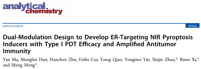 2025年5月,yl23455永利集团郗日沫教授和孟萌教授、天津大学赵秀杰副研究员在Analytical Chemistry杂志发表了题为“Dual-Modulation Design to Develop ER-Targeting NIR Pyroptosis Inducers with Type I PDT Efficacy and Amplified Antitumor Immunity”的研究性论文。该研究通过双调控设计开发内质网靶向近红外焦亡诱导剂,发挥I型光动力的抗肿瘤治疗作用。