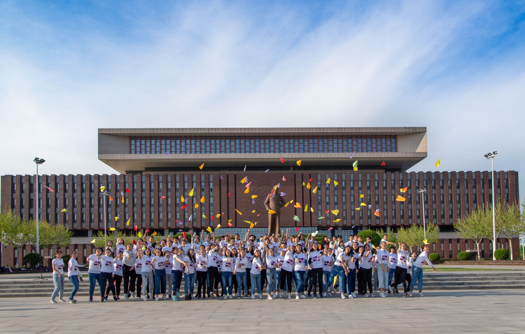 在活动的最后,大家齐唱团歌,高举展牌并将写下自己理想的卡纸折成纸飞机,放飞青春,放飞梦想。随后,为献礼百年校庆,本科2018级、2017级团支部联合研究生2018级、2017级团支部站成“NKU 100”的字样,录制了视频片段。本科生2017级3班团支书郑钦月表示:"2019年4月25日下午,站在同理像前的我,听着头顶无人机传来的嗡嗡声,听到王建宁学姐回忆开国大典时竟然只有17架飞机的新中国,如今连无人机都已走入寻常百姓家。看着周总理和蔼的笑容,我想这社会主义的新时代,这美好的盛世恰如你所愿吧!"