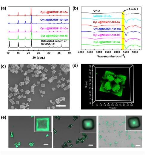 陈瑶课题组利用金属激活剂(Mn2+、Co2+、Zn2+、Ni2+)、方酸配体与酶,在室温水相中自组装形成固体晶态的酶@MOFs复合物(MOFs,Metal organic Framework,是金属有机骨架化合物的英文简称)。通过粉末衍射、红外及激光共聚焦显微镜等技术手段证实酶可以高效快捷的负载到MOF中,并呈现出规律性的分布。