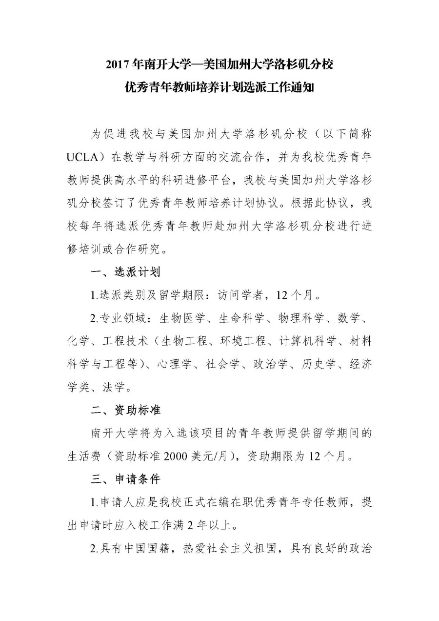 2017年yl23455永利集团-美国加州大学洛杉矶分校优秀青年教师培养计划选派工作通知2016/11/10