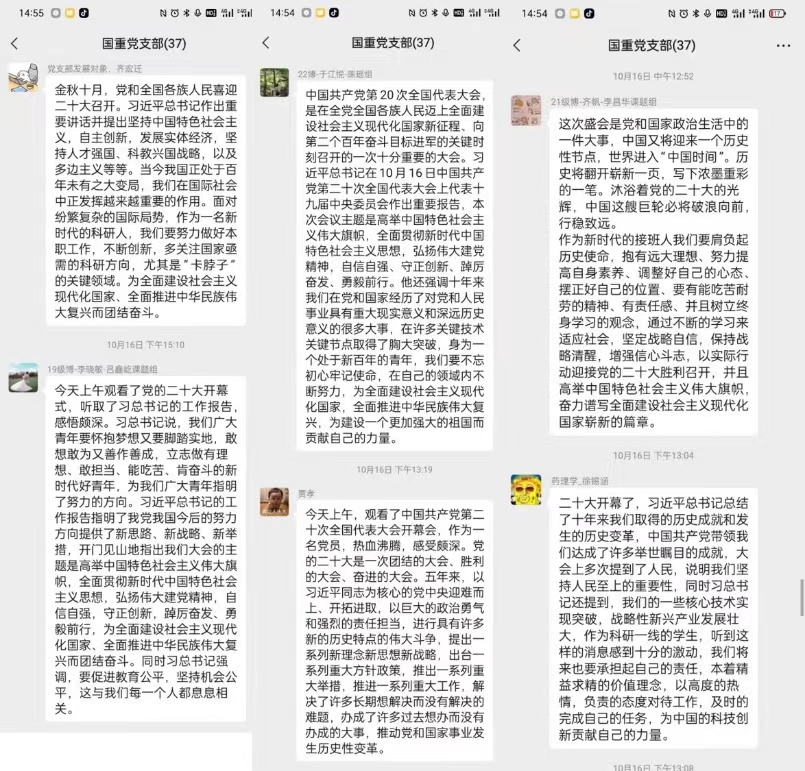 开幕会结束之后,为进一步贯彻领悟党的二十大精神,领悟党辉煌奋斗的百年征程,全体员工党支部积极响应公司党委号召,结合疫情防控要求,以“线上+线下+自学”相结合的方式,围绕学习贯彻党的二十大精神主题,深入开展“三会一课”和主题党日活动,真正把广老员工党员的思想和行动统一到党的二十大精神上来。yl23455永利集团博士生第一党支部、药化生国重博士生党支部、2021级硕士生党支部通过线上、线下交流学习体会的方式来加深学习效果;博士生第二党支部、国重硕士生党支部、2022级硕士生党支部通过党支书讲党课带头领学、支部党员互学的方式,深入学习党的二十大报告原文,巩固学习成果。2020级硕士生党支部、联合研究院2020-2021级硕士生党支部、联合研究院2022级硕士生党支部通过主题党日、主题宣讲和支部共建的方式丰富学习形式,确保学习成果取得实效。11月20日,学院还邀请党的二十大精神员工宣讲团为全体党员进行主题宣讲,再度掀起学习热潮。