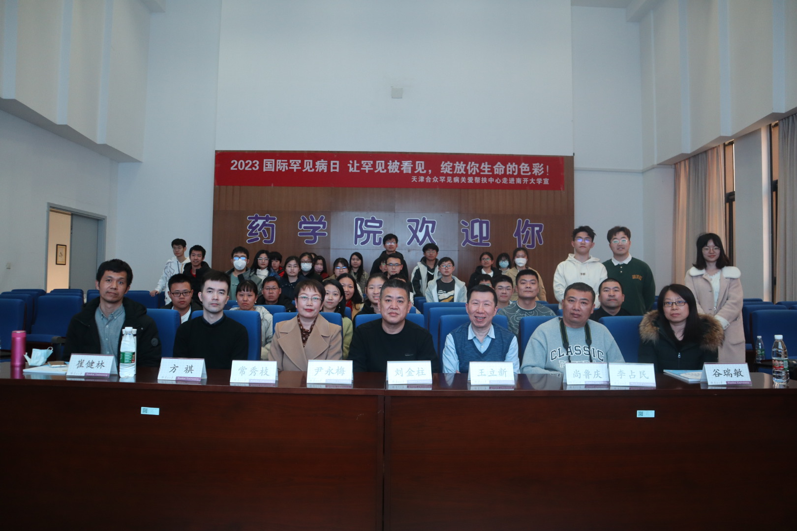 在互动交流环节,面对来自不同专业员工的多种提问,各位罕见病专家耐心细致、详细解答,并鼓励同学们不断深化专业知识,从新药开发上解决罕见病用药难问题,从各领域交叉上不断提高罕见病群体的关注度,共同助力推动实现更加友好的罕见病患者的生活环境。活动结束后参加活动的师生与嘉宾合影留念。